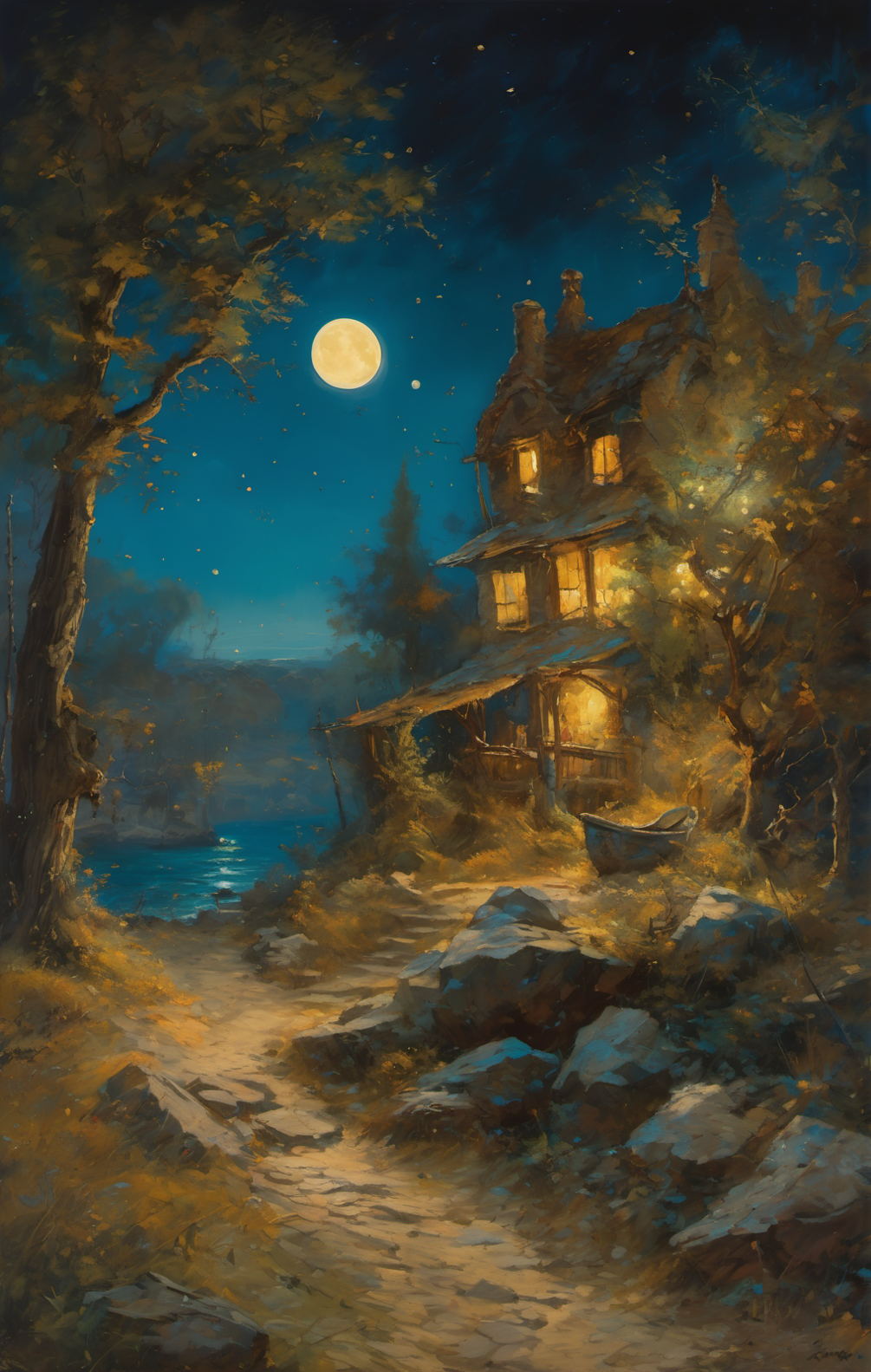 Step into the enchanting world of a house by a lake under the mesmerizing moonlight, captured in the exquisite painting style reminiscent of Gustave Moreau. This breathtaking artwork not only portrays a scene of serene beauty but also embodies a sense of mystery and allure, perfect for adding a touch of elegance to any space. Imagine the conversation-starter this piece will be in your home, sparking intrigue and admiration from all who behold it. Don't miss this opportunity to own a piece of art that exudes sophistication and timelessness - contact us now to make this stunning painting yours.